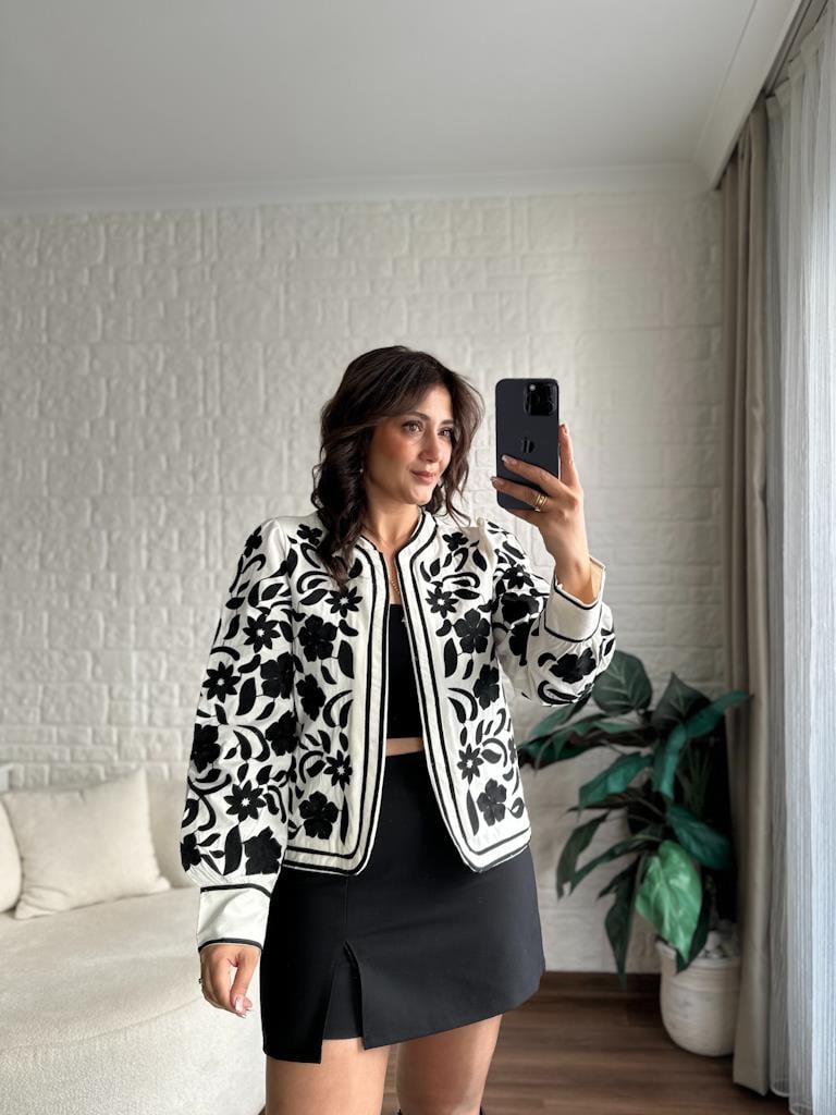 Beyaz Üzeri Siyah Nakış işleme Tasarım Astarlı Ceket