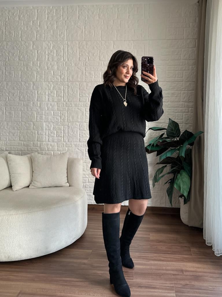 Bisiklet Yak Saç Örgü Triko Takım Siyah