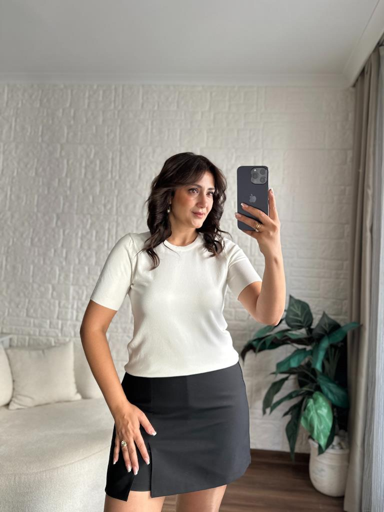 Bisiklet Yaka Kısa Kol Basic Triko Bluz Ekru