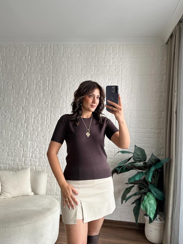 Bisiklet Yaka Kısa Kol Basic Triko Bluz Kahverengi