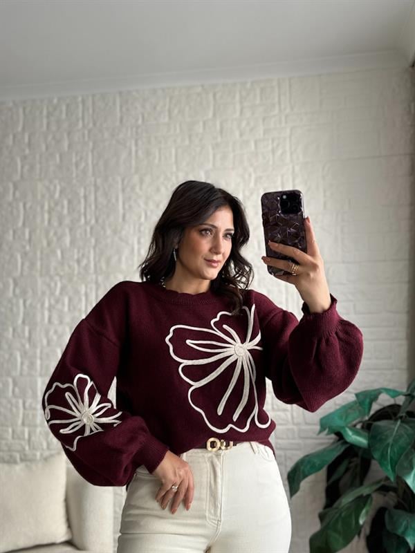 Büyük Süzene Nakış Çiçek Detaylı Triko Kazak Bordo