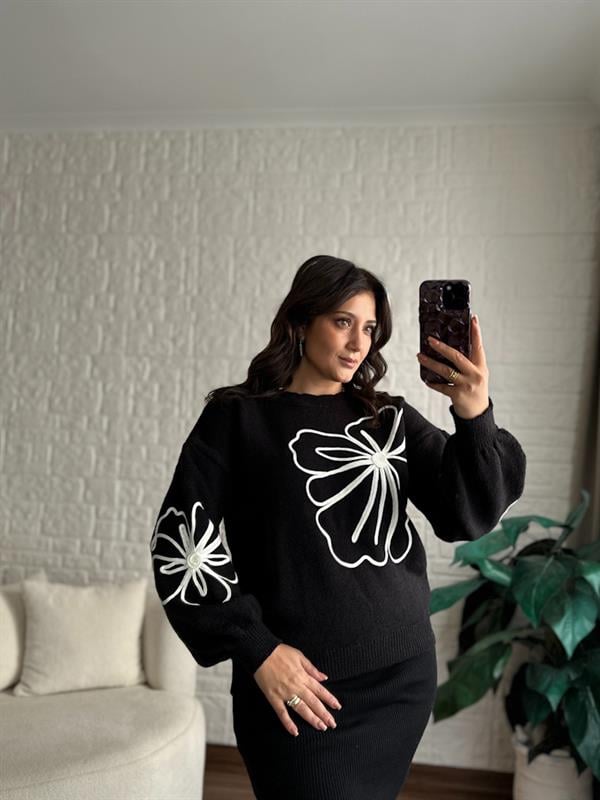 Büyük Süzene Nakış Çiçek Detaylı Triko Kazak Siyah