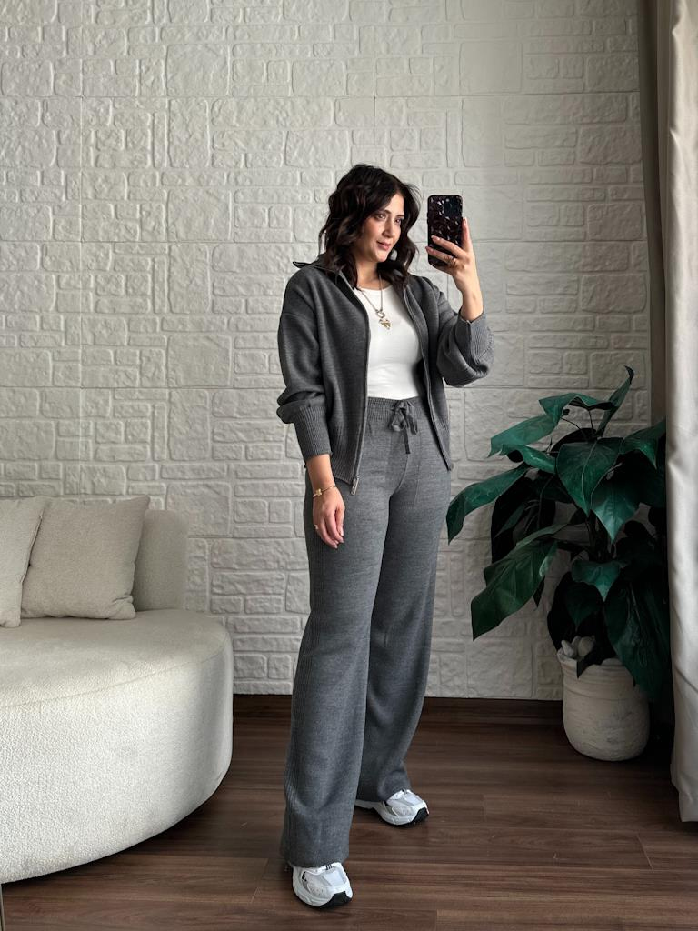 Dik Yaka Önü Fermuarlı Triko Takım Gri