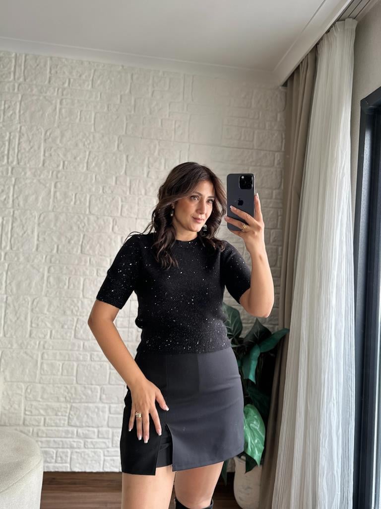 Dilvin Bisiklet Yaka Pullu Simli Triko Kazak Siyah