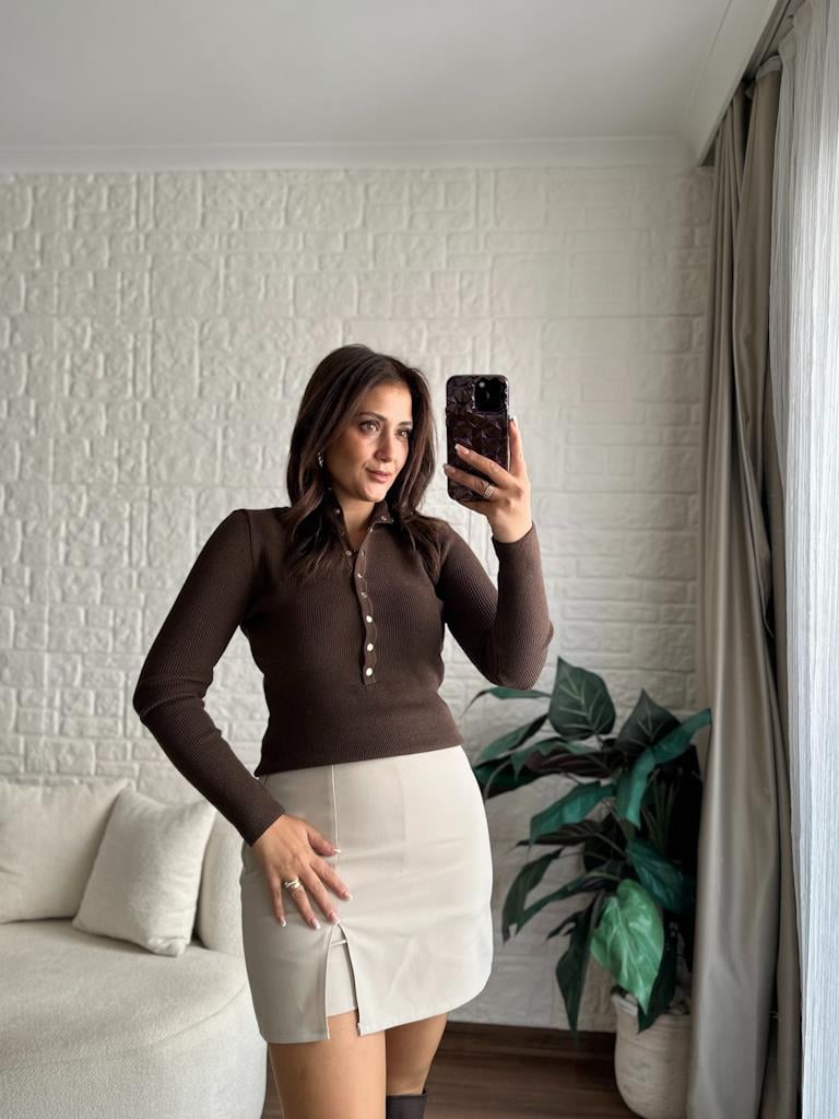 Dilvin Dik Yaka Çıtçıtlı Premium Triko Kazak Kahverengi
