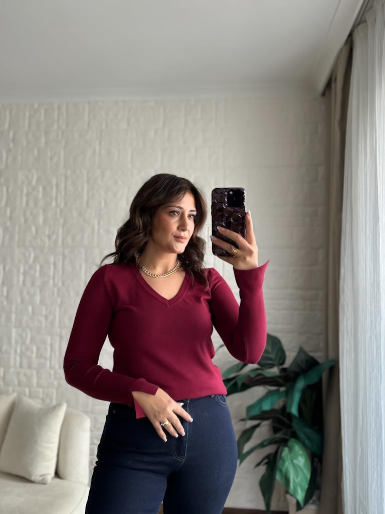 Dilvin V Yaka Kolu Yırtmaçlı Kazak-Bordo