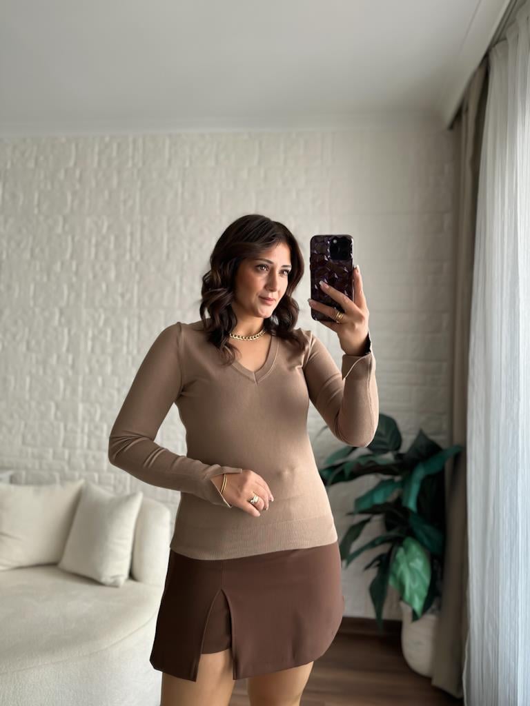Dilvin V Yaka Kolu Yırtmaçlı Kazak-Camel