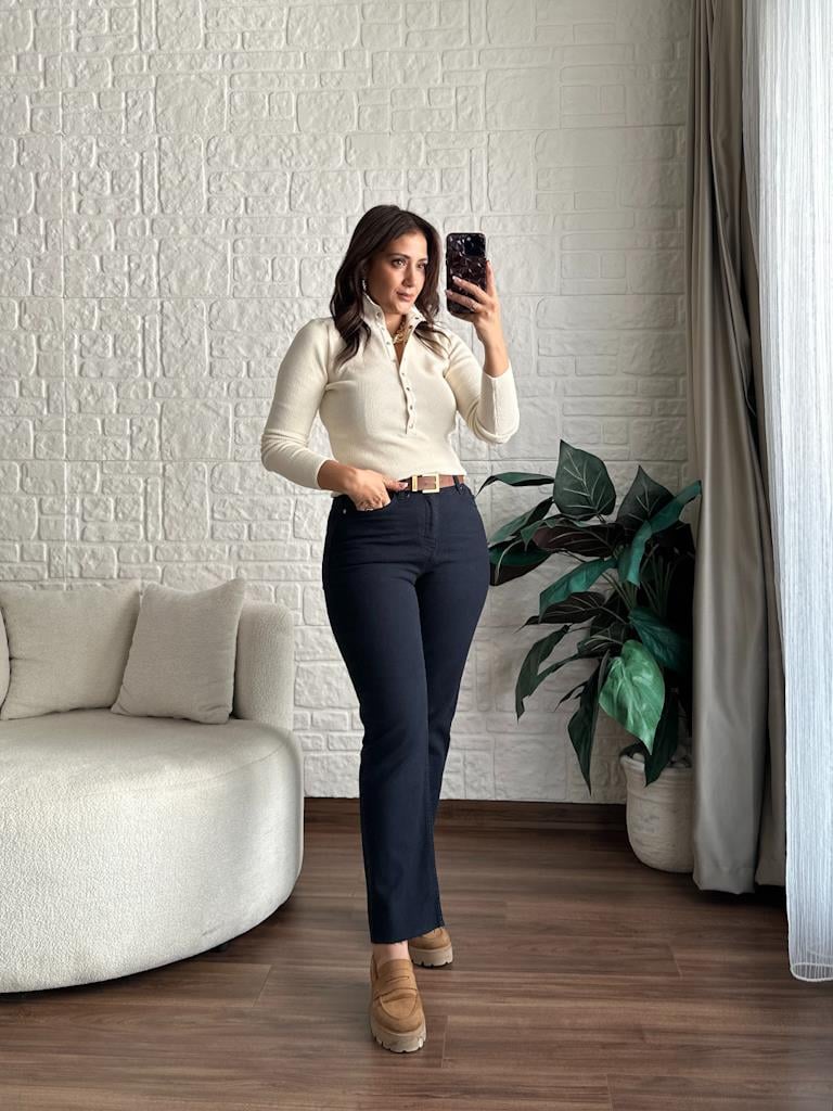 Kesik Paça Yüksek Bel Mom Fit Lacivert
