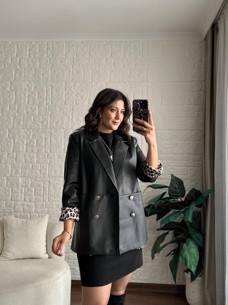 Leopar Astarlı Ön Cep Detaylı Gold Düğmeli Deri Ceket