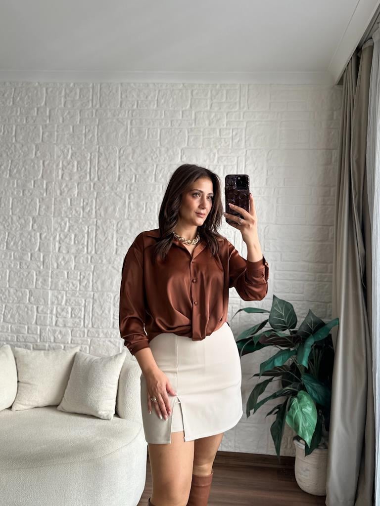Ön Bağlama Detaylı Arkası Uzun Gömlek Bluz Kahverengi