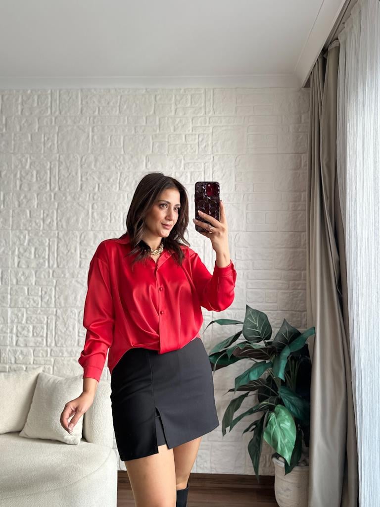 Ön Bağlama Detaylı Arkası Uzun Gömlek Bluz Kırmızı
