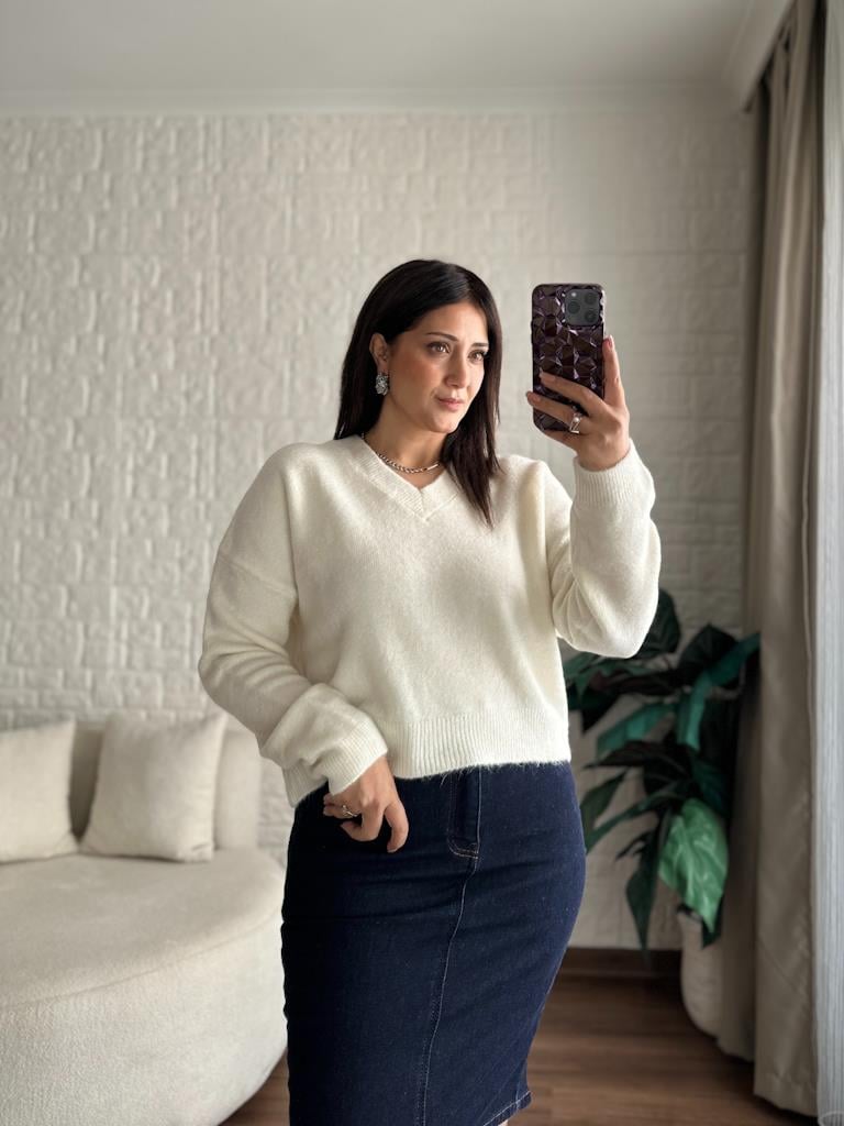 Orijinal Marka V Yaka Kaşmir Yumoş Kazak Krem
