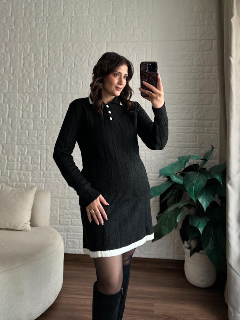 Polo Yaka Geniş Saç Örgü Detay Triko Takım Siyah