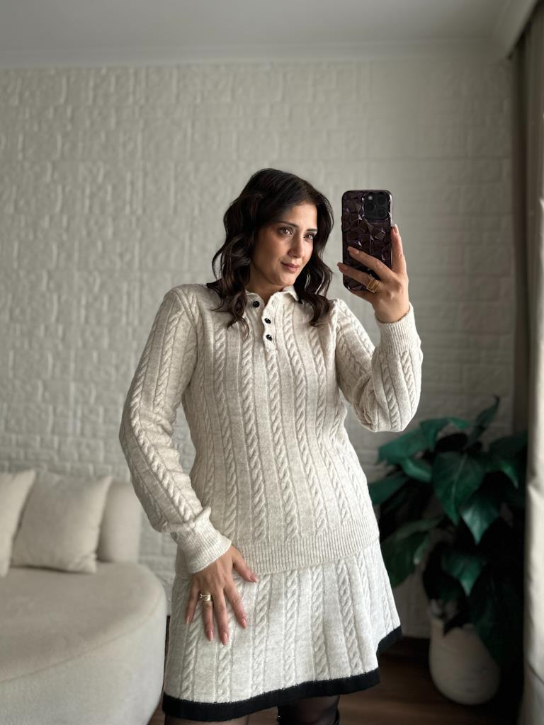 Polo Yaka Geniş Saç Örgü Detay Triko Takım Taş