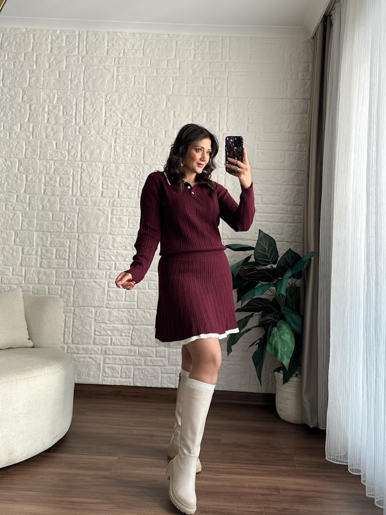 Polo Yaka Örgü Desen İnce Doku Etekli Triko Takım Bordo