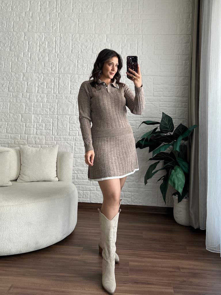 Polo Yaka Örgü Desen İnce Doku Etekli Triko Takım Vizon