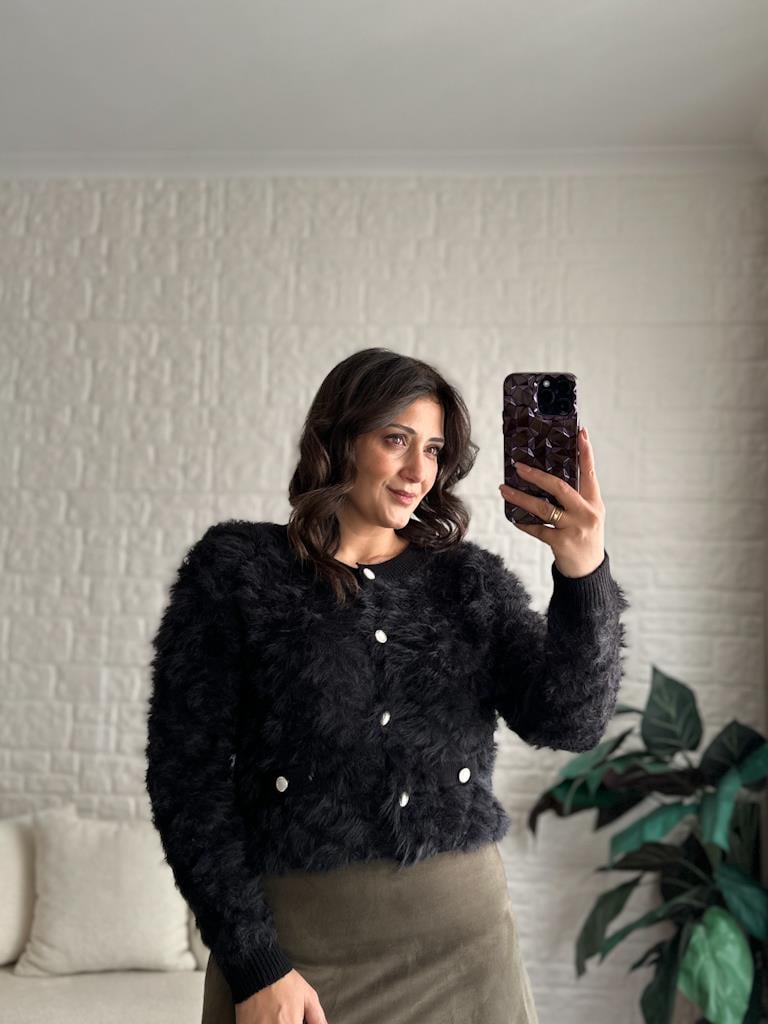 Premium Bisiklet Yaka Taş Düğmeli Sakal Model Triko Hırka Siyah
