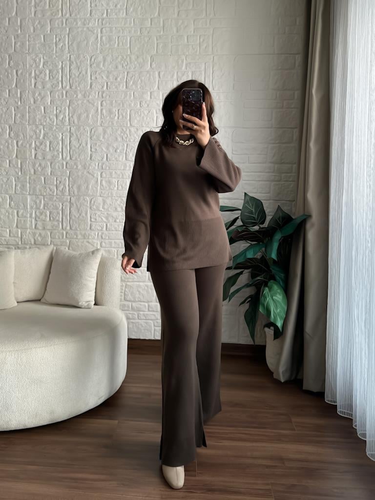 Premium Paça Detaylı Salaş Triko Takım Koyu Vizon