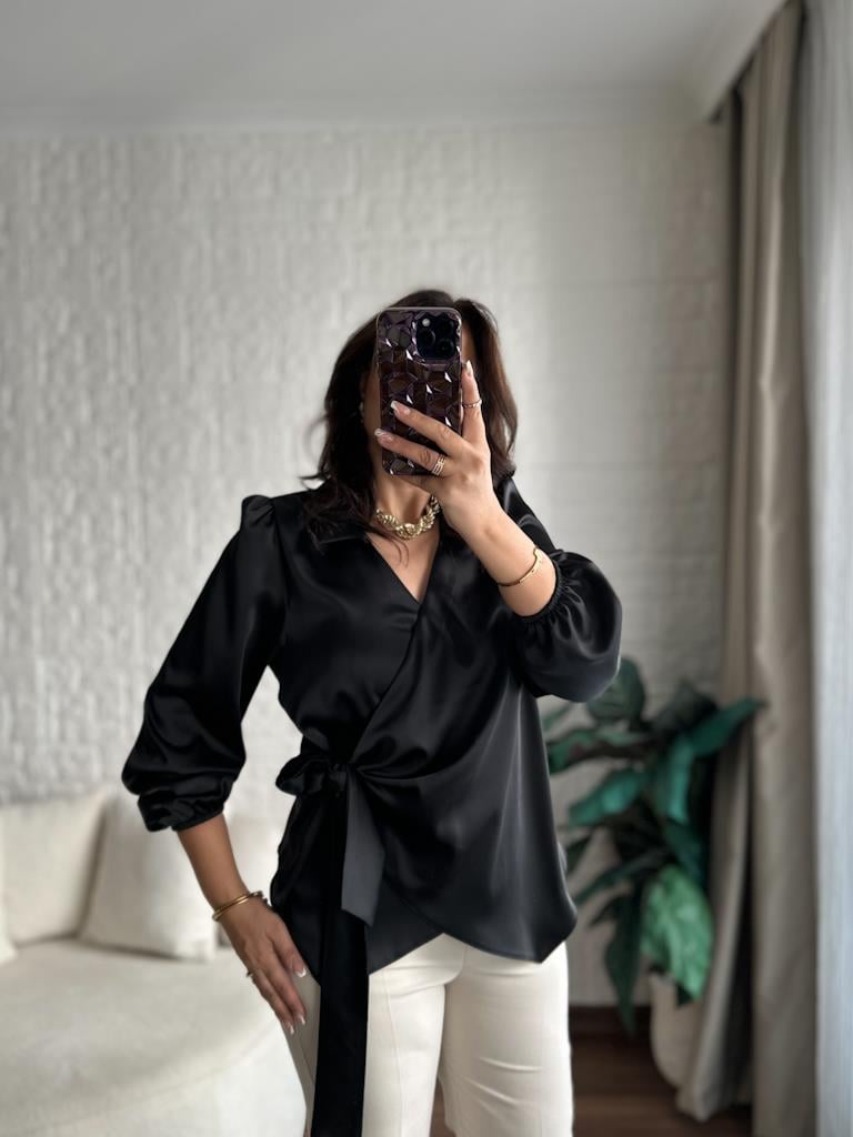 Siyah Kruvaze Yaka Yandan Bağlamalı Saten Bluz