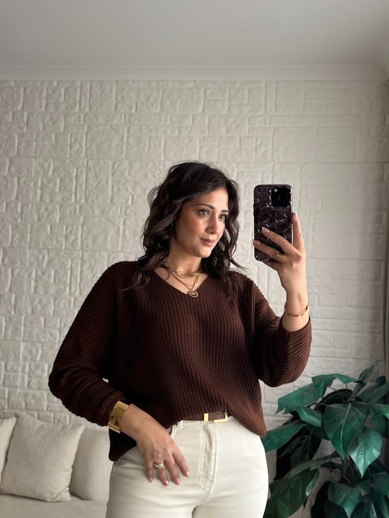V Yaka Selanik Örme Triko Kazak Kahverengi
