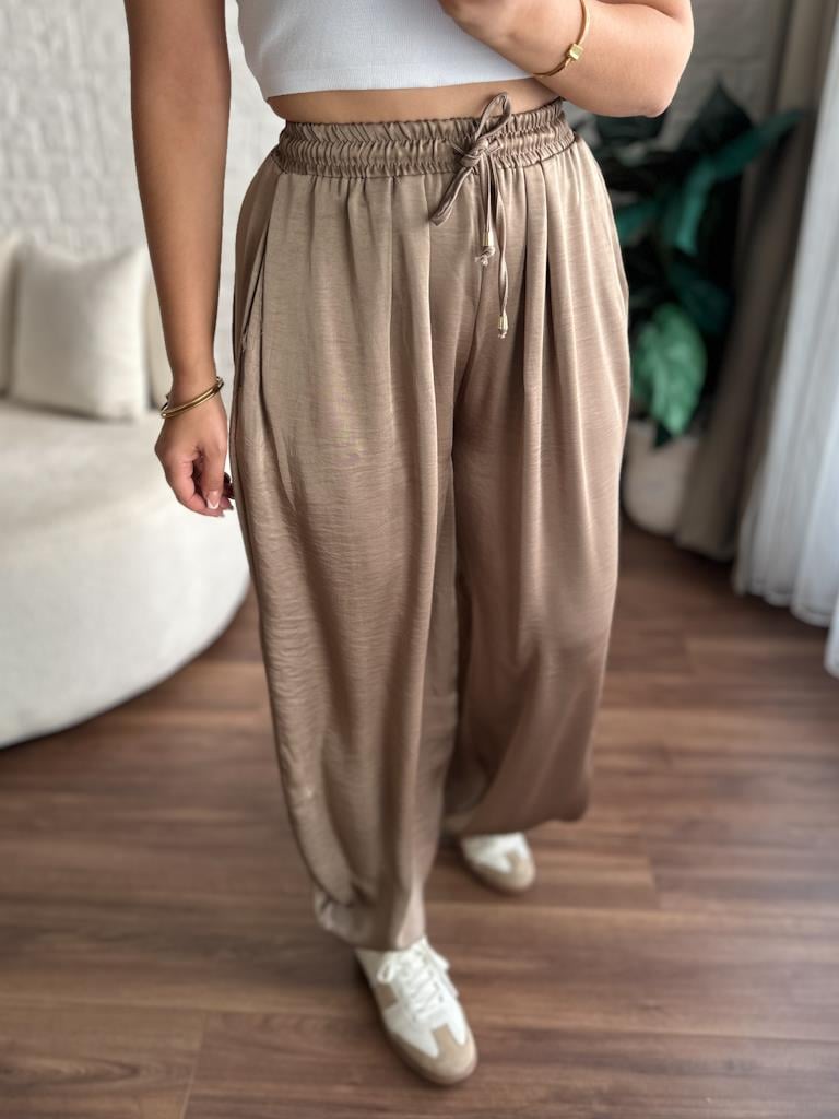 Vizon Bel Bağcıklı Saten Şalvar Pantolon