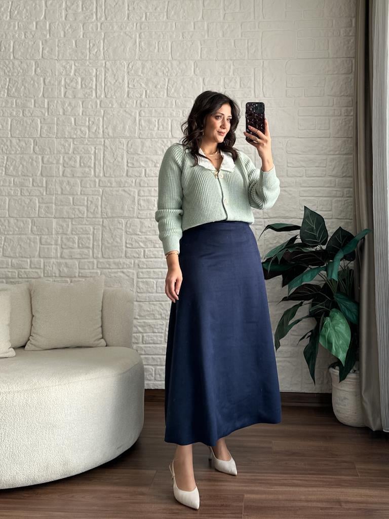 Beli Likralı Maxi Boy Süet Çan Etek Lacivert