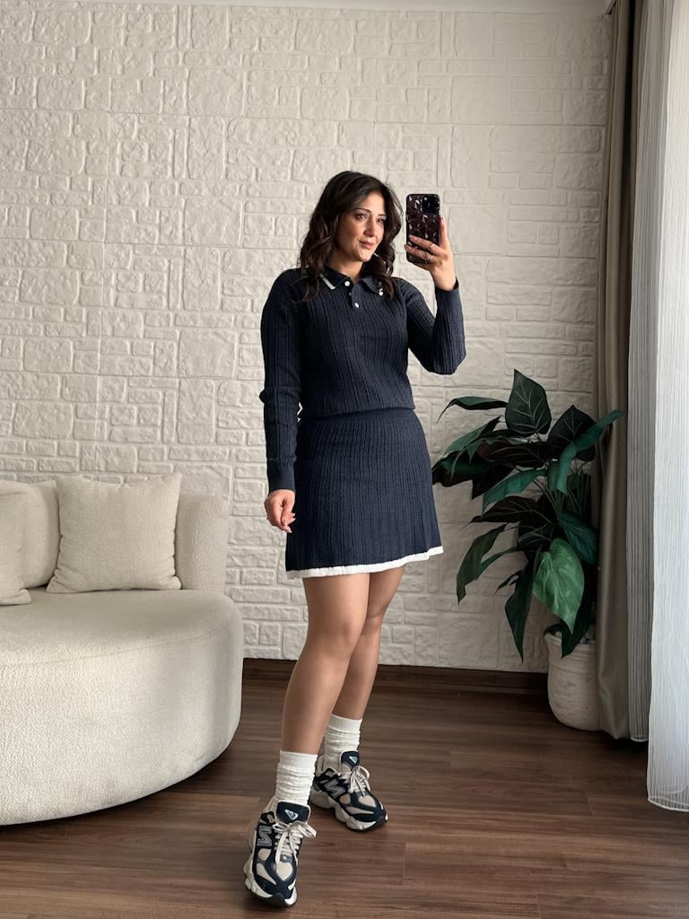 Polo Yaka Örgü Desen İnce Doku Etekli Triko Takım Lacivert