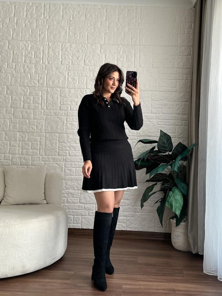 Polo Yaka Örgü Desen İnce Doku Etekli Triko Takım Siyah