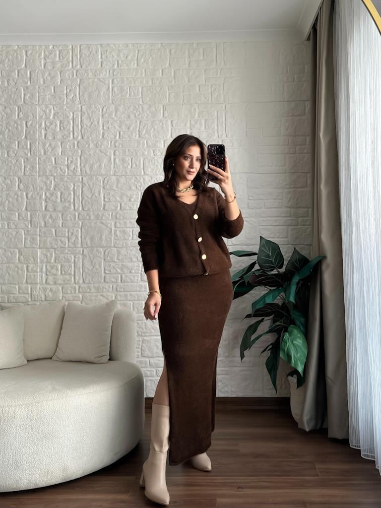 Premiuım Üçlü Etek Hırlka Askılı Bluz Yumoş Triko Takım Kahverengi