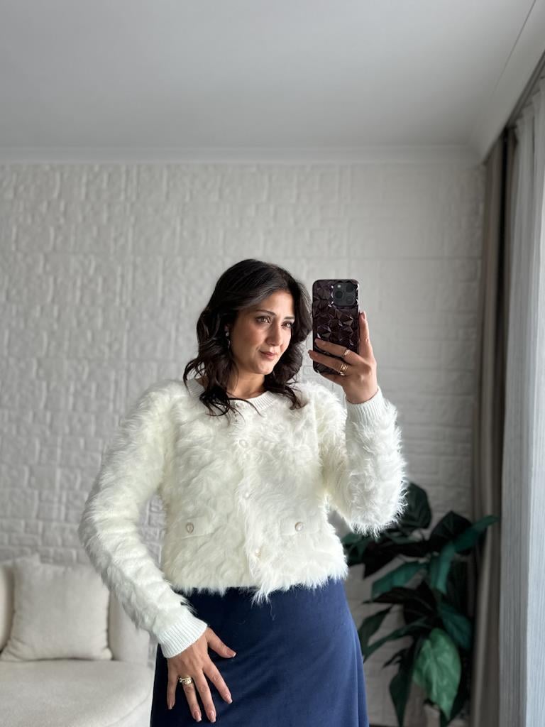 Premium Bisiklet Yaka Taş Düğmeli Sakal Model Triko Hırka Ekru