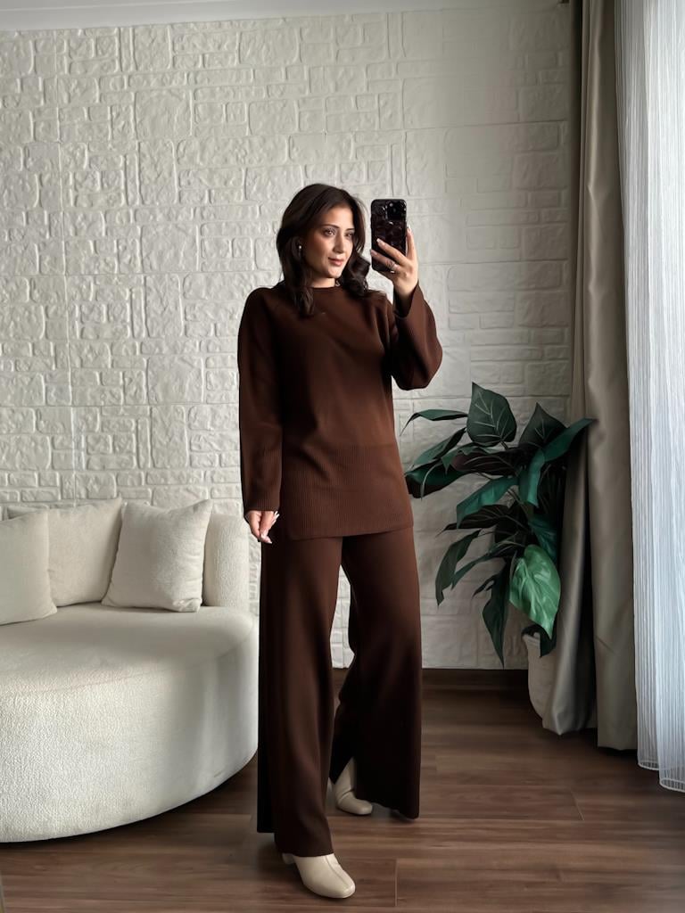 Premium Paça Detaylı Salaş Triko Takım Kahverengi