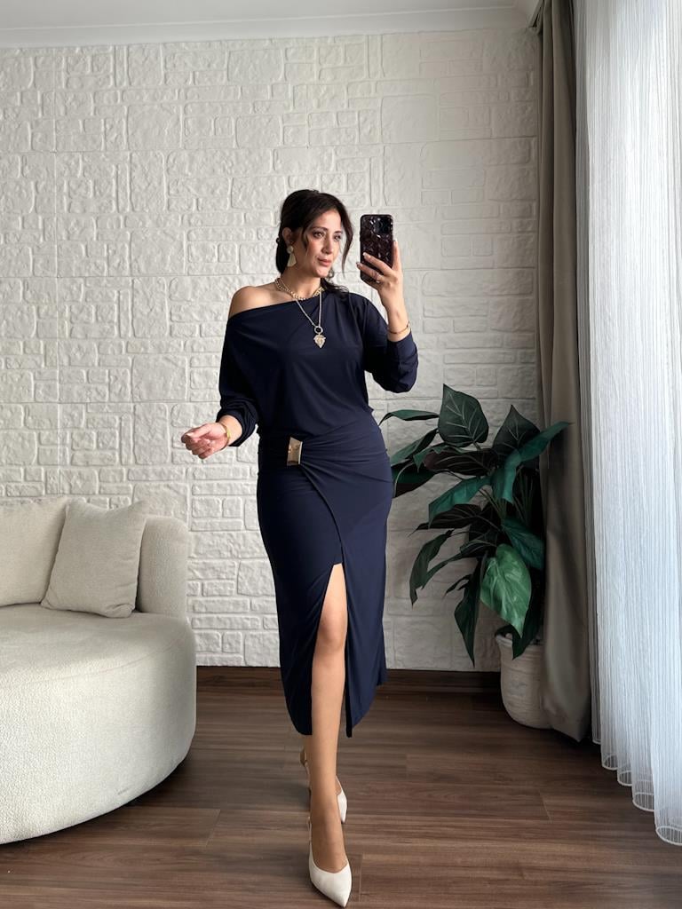 Yarasa Kol Etek Toka Detaylı Sandy Kumaş Elbise Lacivert